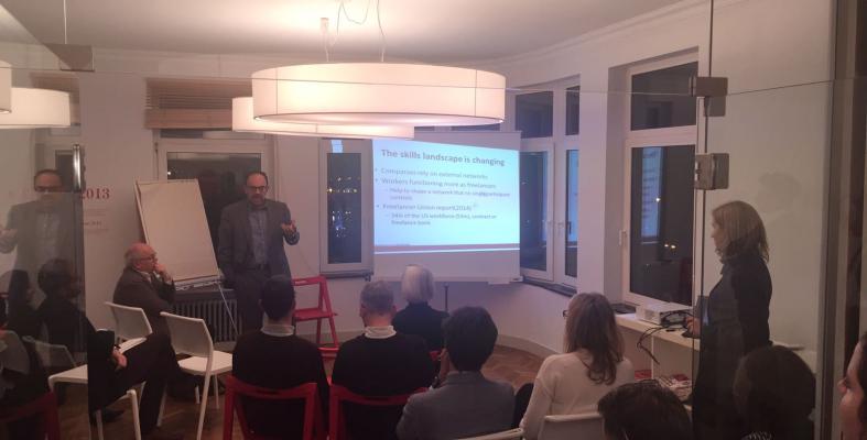 On the 9th of November the first Knowledge Aperò – the networking format by FGB – took place at our premises in Brussels. Terence Hogart, senior advisor of FGB and Agis Papantoniou, Cognizone, introduced and moderated the event “Identifying skills in a borderless workspace: A lens over the Traditional, Open Talent and Gig Economies”. Italian cheese and wine and high level debate animated the evening.